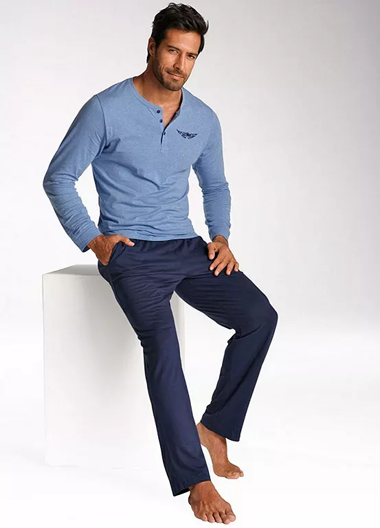 Designed to offer maximum comfort and style, these long pyjamas are crafted from a high-quality cotton fabric. While the long sleeve top boasts a classic round neckline with a short button placket, the trousers feature practical side pockets.