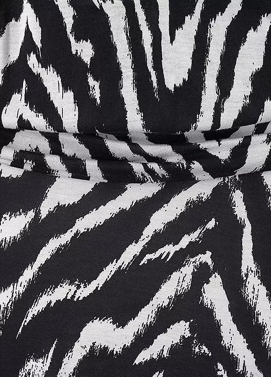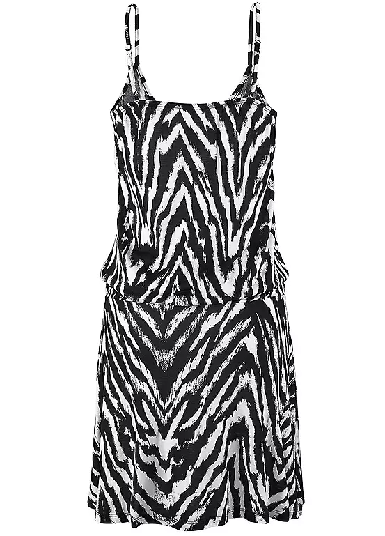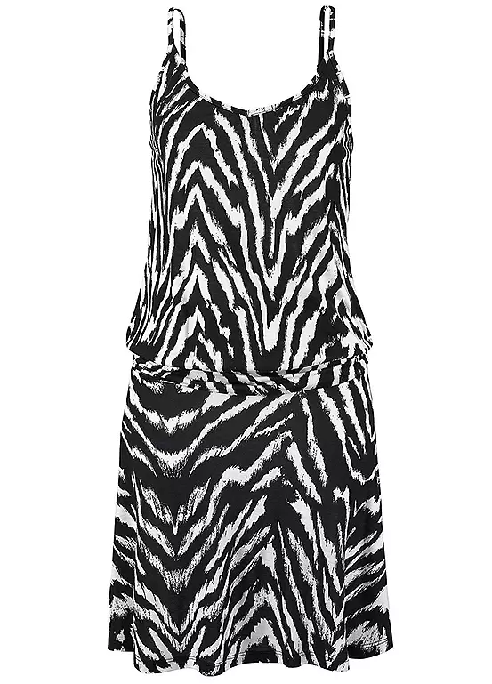 A stylish beach dress with an all-over animal print, each piece is unique. Finished with adjustable spaghetti straps and elaborate ruffles at the hip. Adjustable spaghetti straps. Wide V-neckline. Each part is unique. Length approx. 94 cm.
