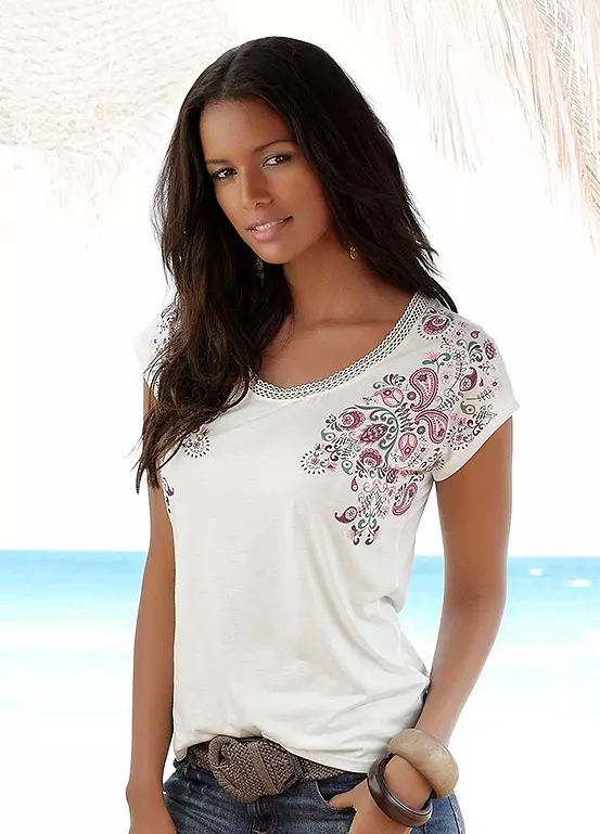Glamorous but comfortable t-shirt, with embroidery details and lace at the neckline. Finished with stylish, overcut shoulders for a great look.