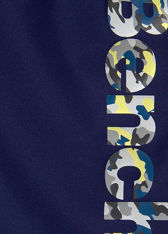 Stylish swimming trunks with hidden drawstring and the logo written at the side in a camouflage look. Cool camouflage logo print.