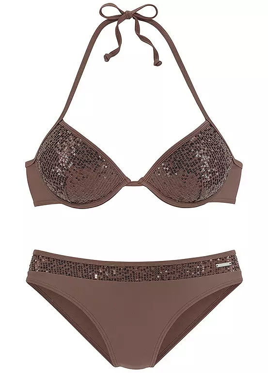 Sparkling push-up bikini decorated with shiny sequins. The bikini top is styled with padded cups and integrated reinforcement. The bikini pants are designed with a sequin insert at the waistband. Made from a highly elastic and comfortable material. Classic back closure. Halter necktie.