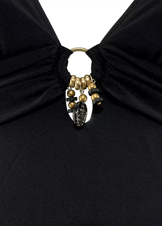 A classic style monochrome swimsuit featuring an elegant gold effect in the middle of the chest. The soft cups feature padding which removed if necessary and conjure up a really beautiful décolleté in combination with a deep neckline, while a round back completes the look. Classic design. Removable soft cups. Gold effect detail. Lower neckline.