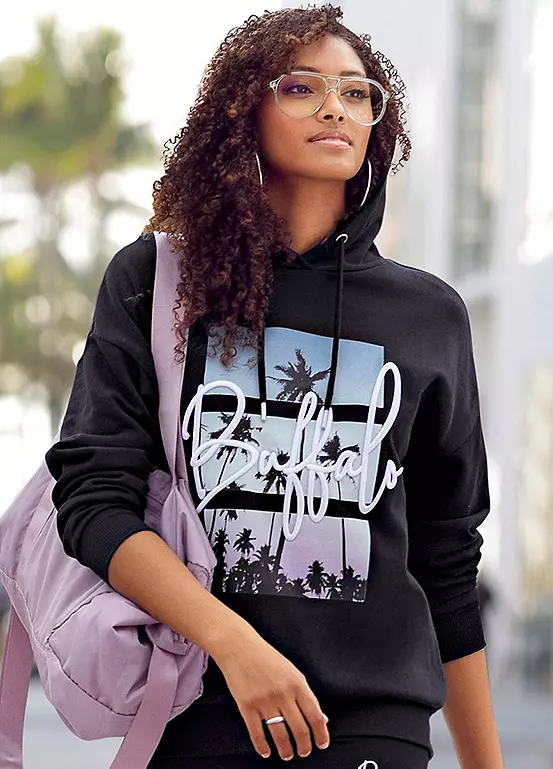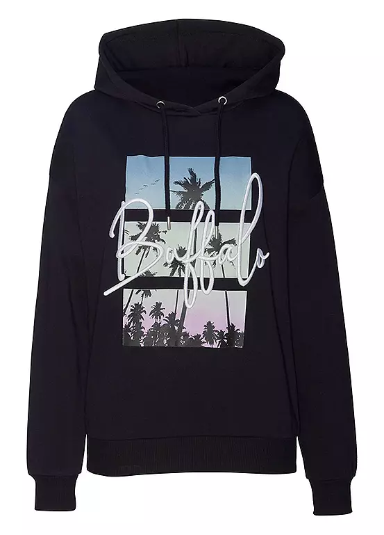 Casual and stylish hoodie with a large photo print and label embroidery on the chest. Ideal for leisure or sport. 3D embroidery on the chest. Hood with drawstring.
