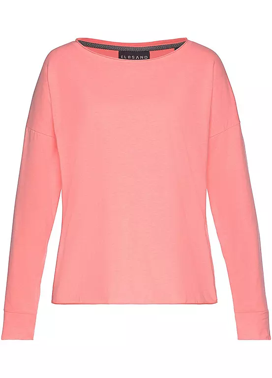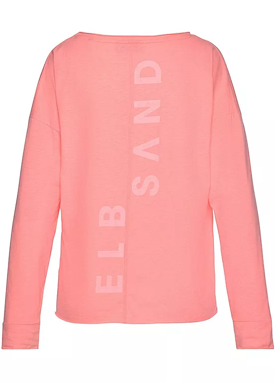 Fashionable top with a large logo print and dividing seam on the back. Styled with dropped shoulders and long sleeves. Wide round neckline. Overcut sleeves. Straight hem. Made from soft jersey fabric. Length approx. 62 cm.