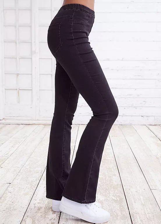 Fashionable flared leg jeggings that feature an elasticated waistband for added comfort, as well as faux front pockets and handy back pockets. Made from a soft material mix with stretch content for the perfect fit. Back pockets.