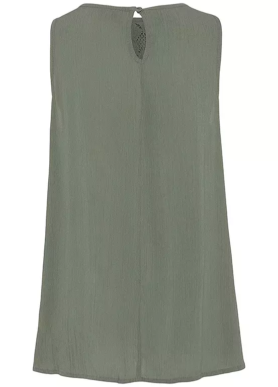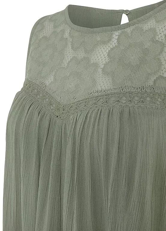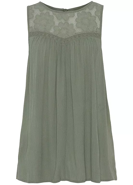 A charming beach blouse made from light crepe material, featuring an embroidered lace insert in the bust area. Ruffled underneath, it comes with a slightly flared hem and also features a button fastening and small slit at the neckline for added comfort. Length approx. 62 cm (24½ ins).