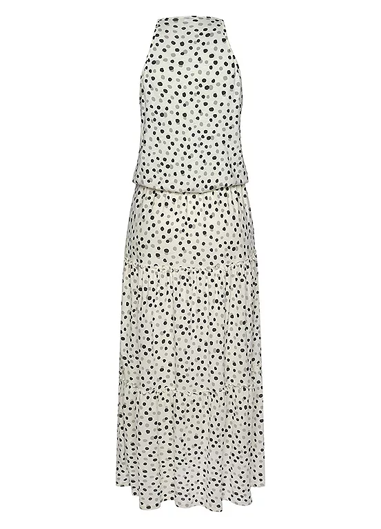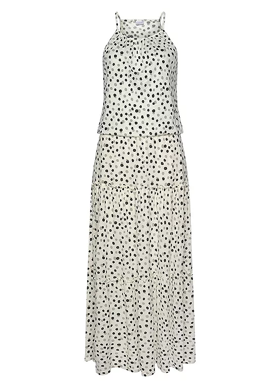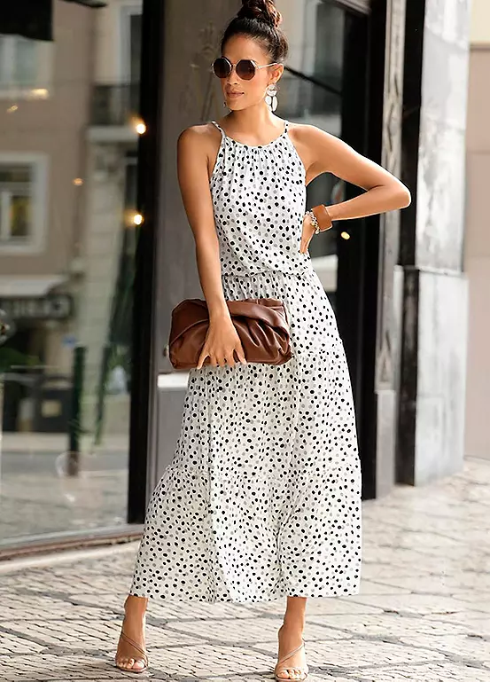 A stylish summer dress with narrow spaghetti straps. The back has a playful slit on the neck and button closure, finished with a stretch band at the waist and a pretty polka dot print.
