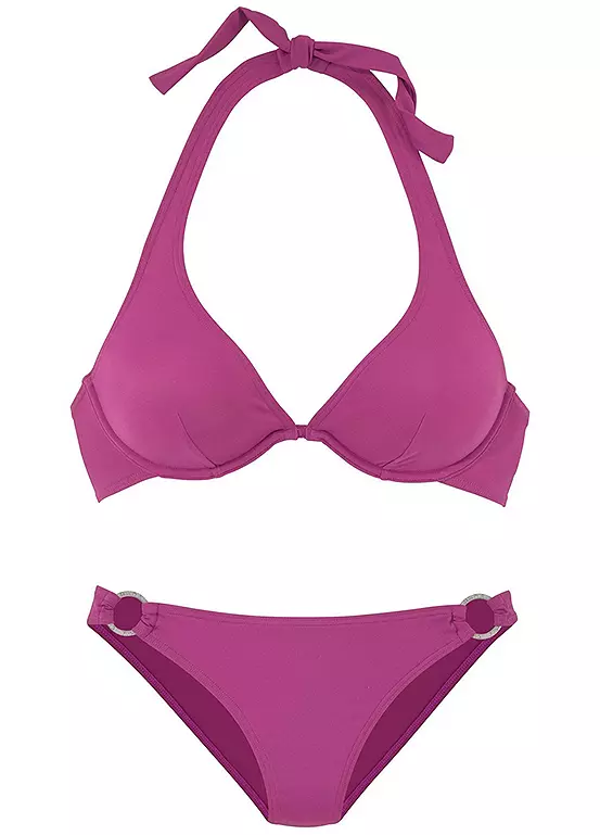 Fabulous bikini which has been designed with halterneck straps that give you a great top line. This flattering swimwear has a cool retro ring detail on the briefs, and it is front lined for comfort.