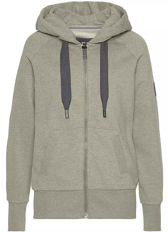 A comfortable hooded sweat jacket from Elbsand featuring a hood with a drawstring, long raglan sleeves, ribbed sleeve panels and hand pockets. Made of soft high-quality sweat fabric, it’s perfect for home wear and features a wide hem and cuffs, plus a large embroidered logo on the hood. Large hood with drawstring. Long sleeves with ribbed inserts.