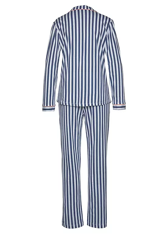 The vertical all-over stripe pattern of these pyjamas with edging in contrasting colours and a button placket ensure a trendy look and flatter your figure. The high-quality cotton promises maximum comfort. An elasticated waistband with a decorative bow offers support without pressing uncomfortably. In order to stow important little things, discreet breast and trouser pockets adorn the pyjamas.Keep away from fire.