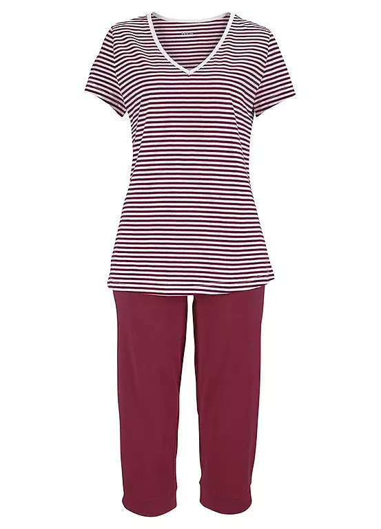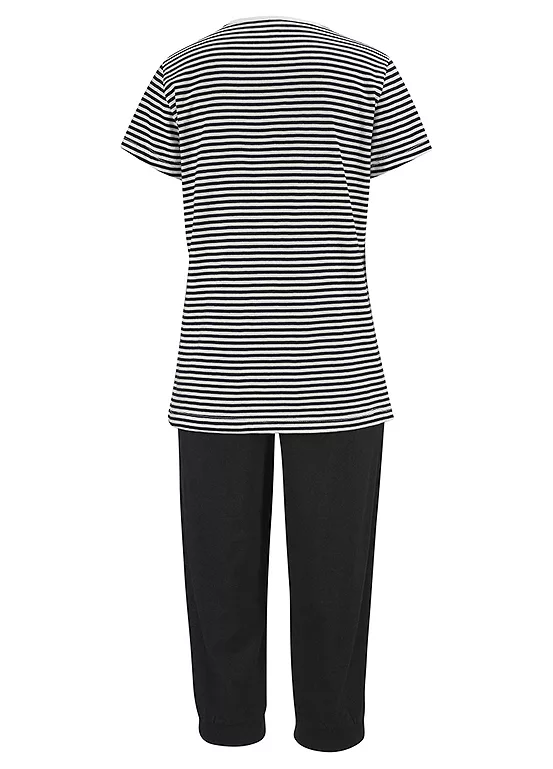 Enjoy the comfort of jersey fabric, with a fab style that is perfect for lazy weekends at home! Featuring a striped top with classic v-neckline and short sleeves, along with three-quarter length Capri trousers with side pockets and elasticated waistband and leg cuffs for great comfort.