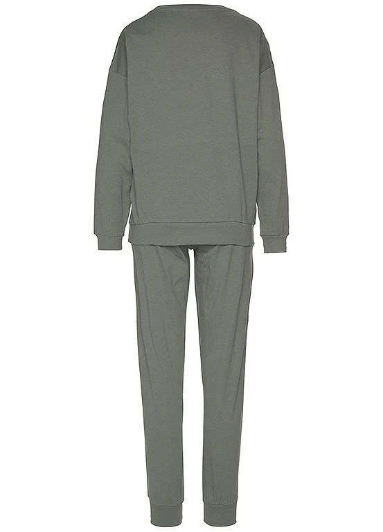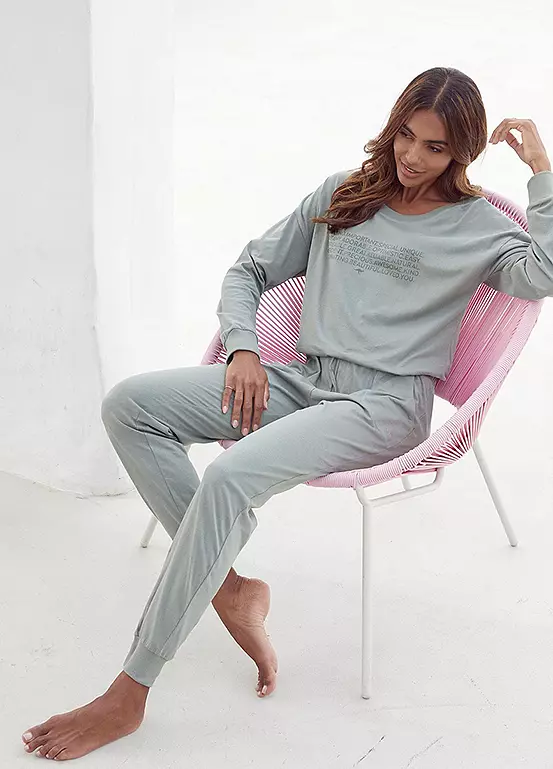 Comfortable pyjamas in soft single jersey fabric featuring a long sleeve top with a slogan print on the front, a round neckline and raglan sleeves. The relaxed look is complete with long pyjama bottoms with an elasticated drawstring waistband and cuffs at the ankles. Side pockets. Slogan front print. Ribbed cuffs at the hems.