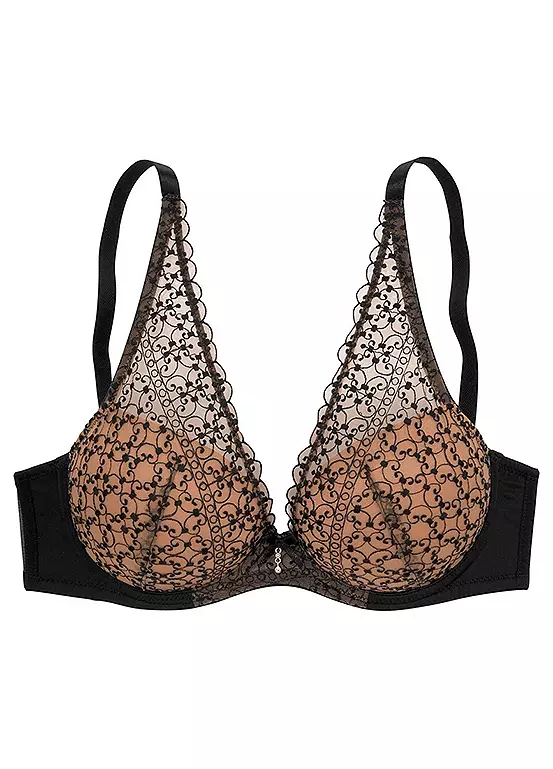 Stylish padded bra with beautiful embroidery lace in a modern look and slightly transparent mesh material. Features adjustable straps and back closure. With beautiful embroidery lace in a modern look. Slightly transparent mesh material on the sides. Small glitter accessory in the centre front. With beautiful embroidery lace in a modern look. Slightly transparent mesh material on the sides.