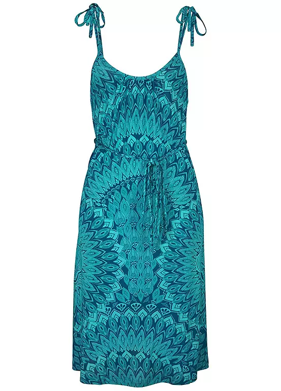 A modern beach dress in an eye-catching all-over print design. Features a rounded neckline and narrow straps that tie to fasten, along with decorative tassels, which can be removed, as well as a thin tie belt at the waist. Length approx. 78 cm (30¾ in).
