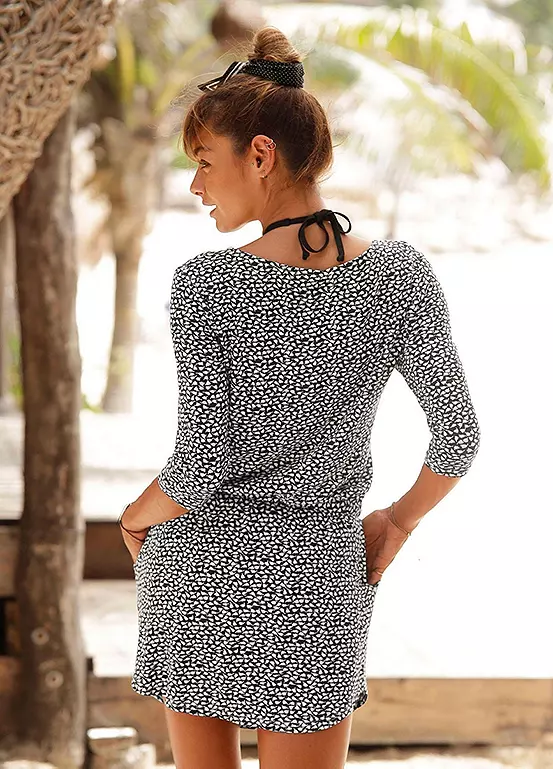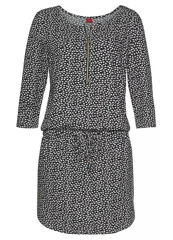 A sophisticated all-over print mini length dress with gold coloured zip on the neckline, side pockets, elasticated waistband and gold coloured accessories. Finished with a rounded hem and an embroidered logo. Length approx. 88 cm (34¾ in)