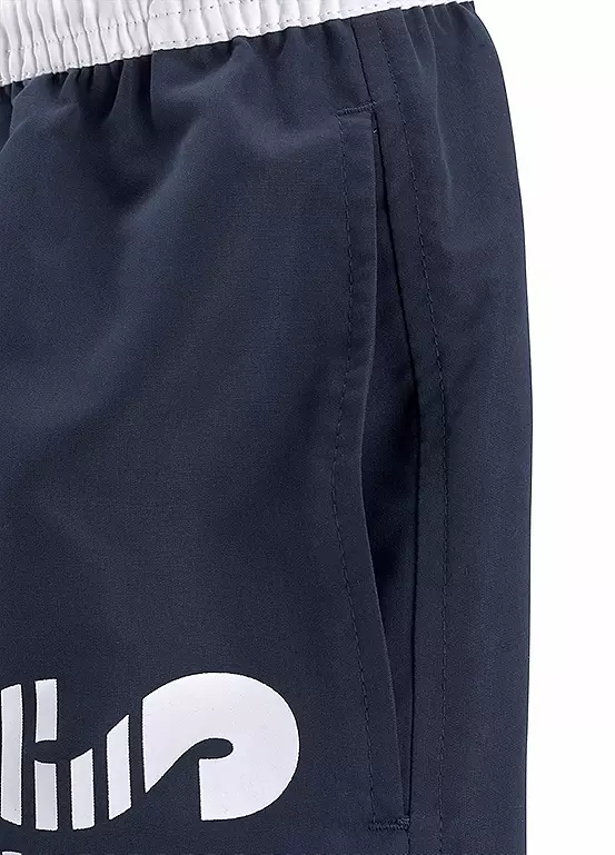 Fashionable swim shorts featuring large logo detail, an elasticated waistband with an outer cord, side pockets and a rear pocket with Velcro fastening. Finished with a comfortable lining and a small pocket.