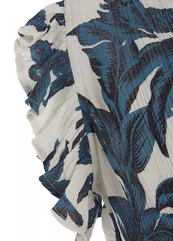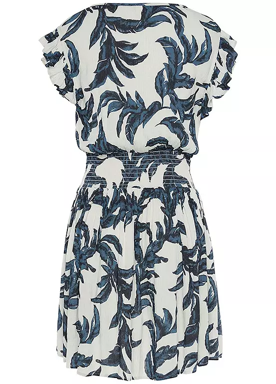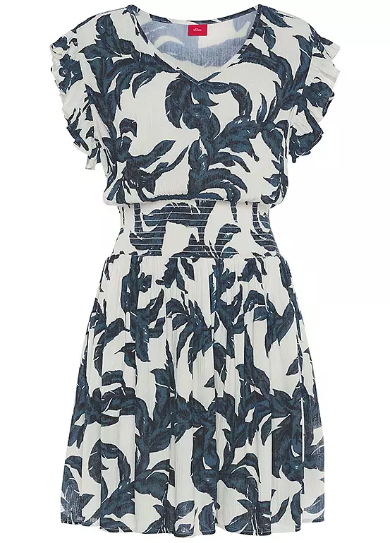 A feminine printed skater dress by s.Oliver in comfortable crépe fabric with a v-neckline, ruffled cap sleeves and wide smocking at the waist. Printed all over, each piece is unique. V-neckline. Playful cap sleeves. Machine washable. 100% Viscose.
