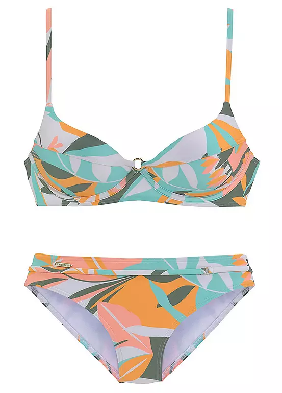 The underwired bikini is a real eye-catcher with its trendy leaf design. The padded cups and adjustable straps offer good support. The trousers have a decorative belt.