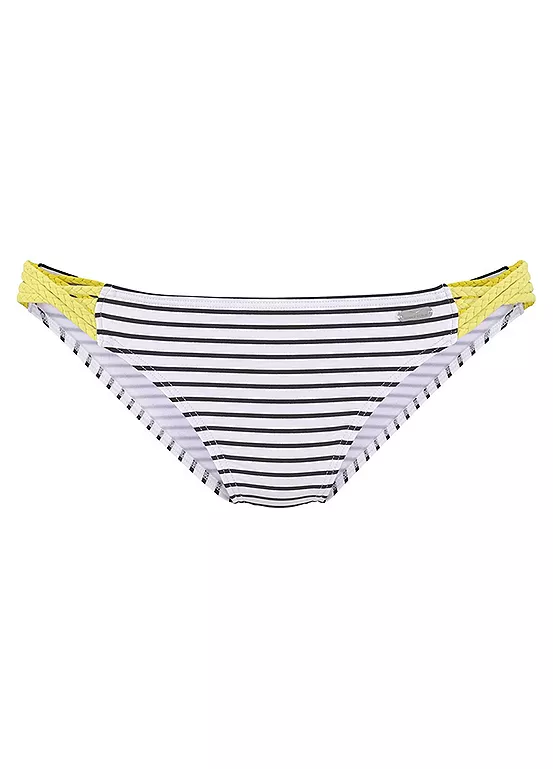 Bikini bottoms in a striped print with contrasting details. The braided straps are also a great detail while the soft microfibre fabric is light, sits nicely on the body and dries quickly. In a stripe print with contrasting details. Side braided straps.