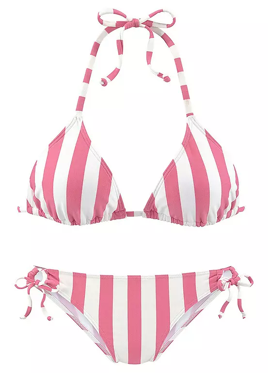 A maritime-style triangle bikini set by Venice Beach in a stripe design. The top features removable soft cups and ties at the neck and to close at the back. The matching briefs come with side ties. Removable soft cups. To close in the back. Briefs to tie at the side. Removable soft cups. To close in the back.