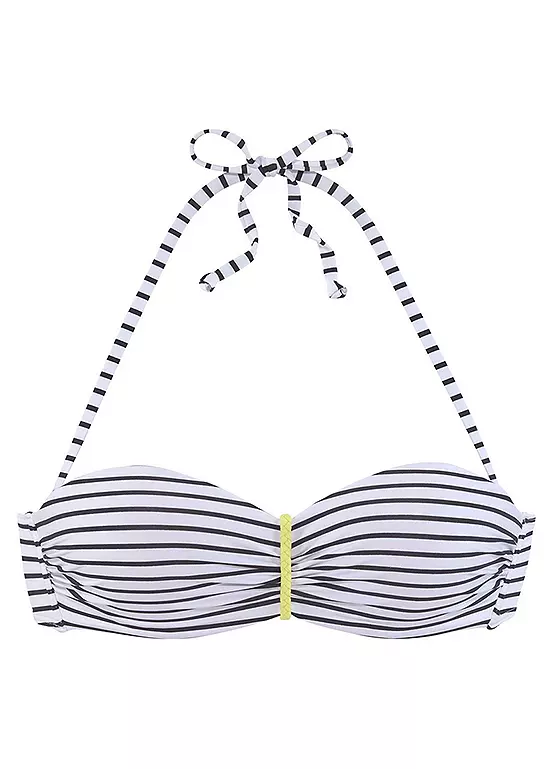 In a striped design and braided contrast detail, the padded cups on this bikini top conjure up a great décolleté, and the boning on the side provides the necessary support. You can remove the straps if necessary or tie them in the neck. A perfect mix and match piece. Braided contrast details. Removable cups for cup A and B. Side boning.