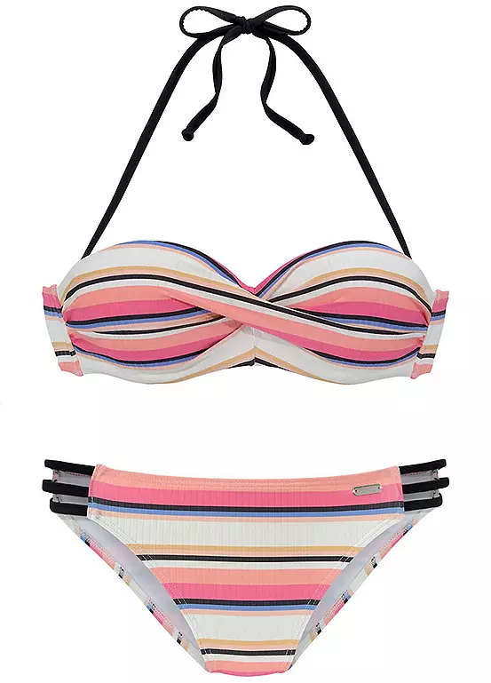 Underwired bandeau bikini by Venice Beach in a trendy striped design with contrasting details. Comfortable to wear thanks to the recycled polyamide, it features detachable neck straps, side boning and padded cups with integrated pads for A and B cups. The matching bottoms feature decorative straps at the sides. Trendy stripe design. Padded cups with integrated cushions for A & B cups. Hand wash. Outer: 92% Polyamide, 8% Elastane. Lining & Padding: 100% Polyester.