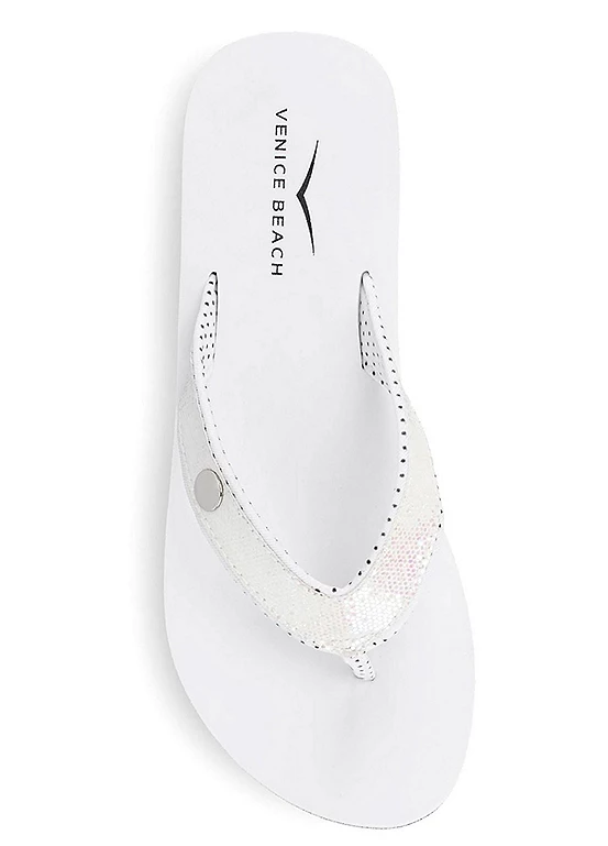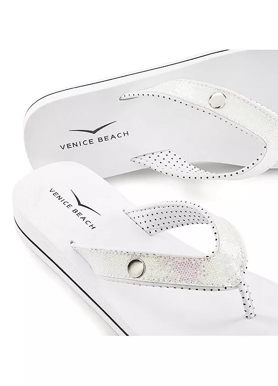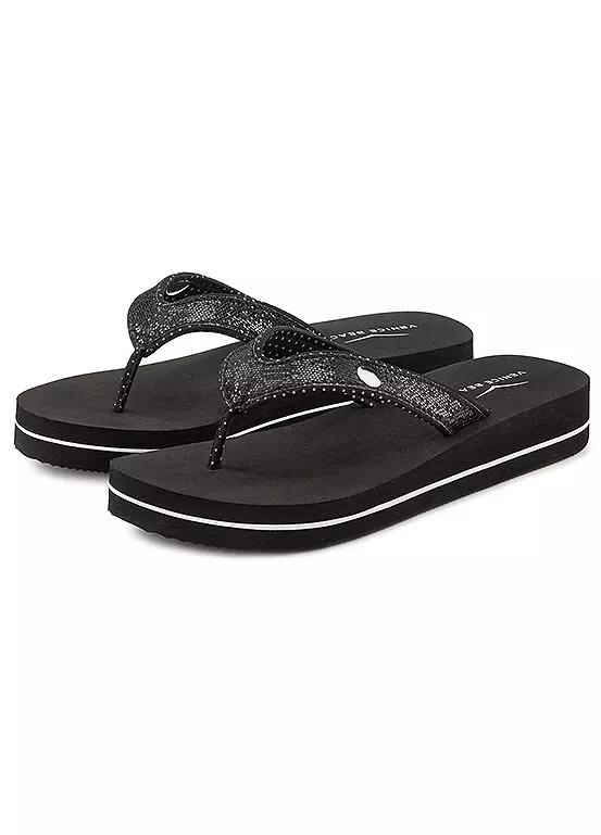 Pretty flip flops in a classic shape with a slight heel and a relaxed style. Finished in a trendy glitter effect with fine embossing, a slightly profiled sole and water-repellent material. Water-repellent material. Decorated with subtle glitter. Peta approved vegan – free of animal components. Heel height approx. 3 cm.