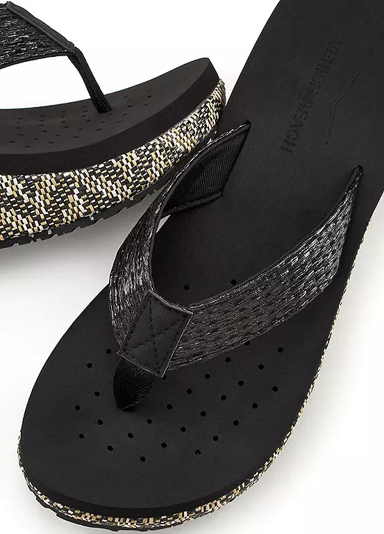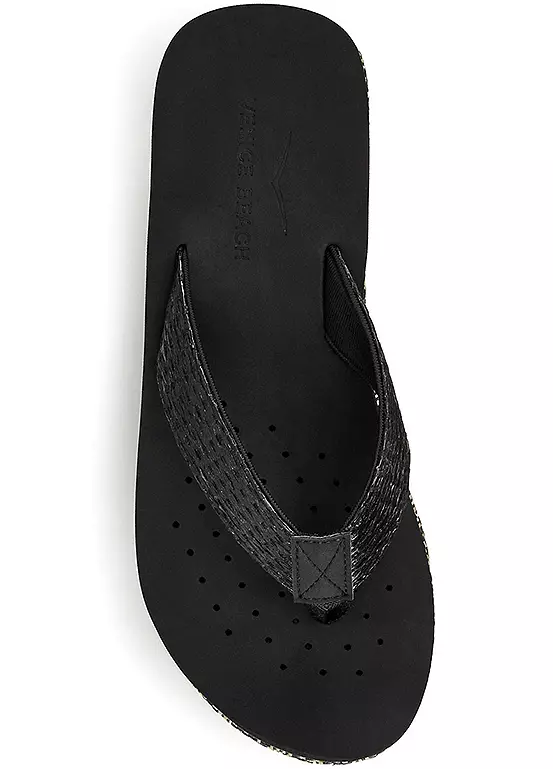 Casual summer flip-flops with a patterned wedge heel and water-repellent material. Upper and lining: Textile. Insole and sole: Synthetic. Vegan – free of animal components.