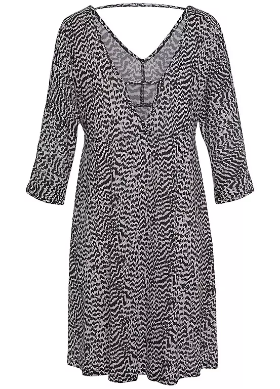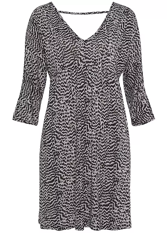 The deep v-necklines at the front and back make this all-over printed dress a special eye-catcher. It also has fashionable straps on the back that give the cut stability. The casual three quarter sleeves with a slit complete the design. The dividing seam under the bust with subtle ruffles ensures a great fit, while the soft jersey fabric provides even more comfort. Animal print. V-neckline. Machine washable. 100% Viscose.
