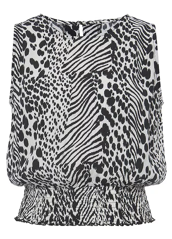 An animal print top featuring a simple scoop neckline with a slit and button closure that blends with a wide smocked waistband at the bottom hem. The slightly structured woven fabric made of flowing viscose is ideal for warmer days.