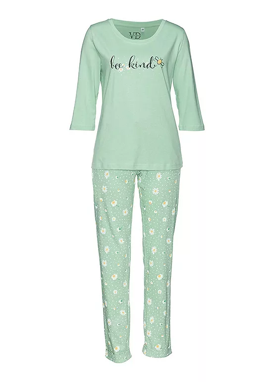 These comfortable pyjamas impress with their design and wearing comfort. The pyjama bottoms are designed with an all-over print that is particularly eye-catching and an elastic waistband to offer you the perfect fit. The top is in a monochrome design that contrasts the printed pyjama bottoms. Soft single jersey quality made from pure cotton.
