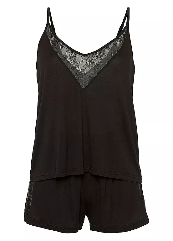 Get ready for a dreamy night’s sleep in this stylish set – shorty pyjamas with beautiful lace details. The cami top features a V-neck at the front and back, while the shorts feature an elasticated waistband and lace side inserts. Made from a soft viscose blend, these PJs are perfect for a comfy night in! Shorty pyjamas with beautiful lace details. Cami top with V-neck at the front and back. Made from viscose blend.