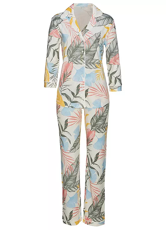 Classic-cut pyjamas in an all-over leaf print that creates a stylish appearance. The pyjama shirt is designed with a short lapel collar, a button placket and summery three-quarter length sleeves. The pyjama pants offer a lot of comfort thanks to the elastic waistband with drawstring and open pockets. The single jersey fabric made from a soft cotton-viscose blend flatters your skin.