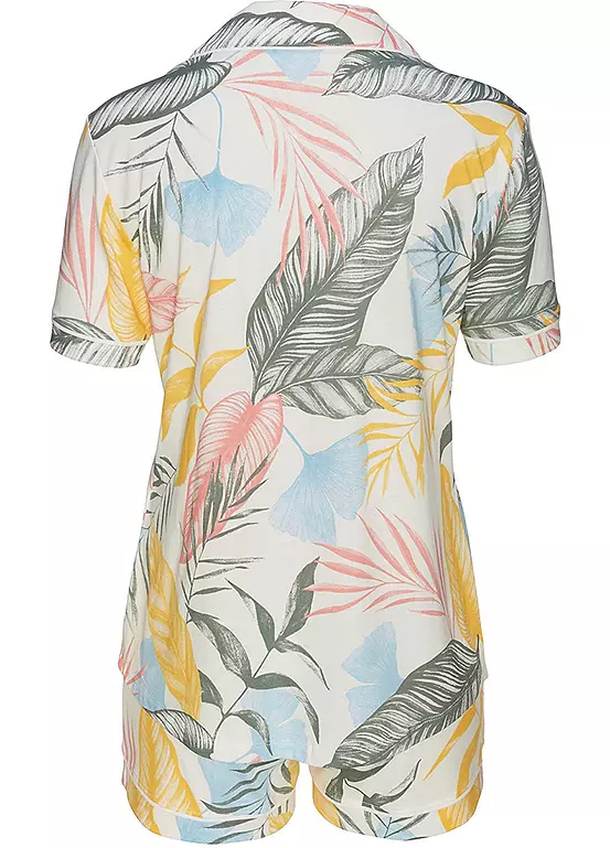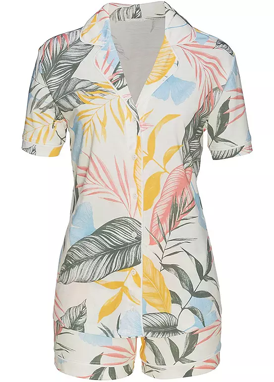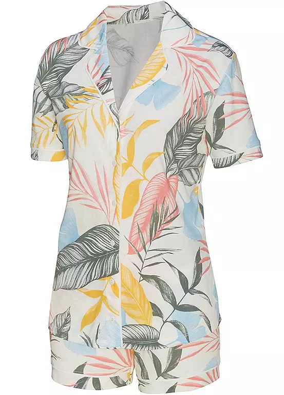 Classic shorty featuring a shirt with a short lapel collar, front button placket and short sleeves. The sleep shorts are designed with an elastic drawstring waistband. Shirt with a short lapel collar, a front button placket and short sleeves. Single jersey quality made from a cotton-viscose mix.