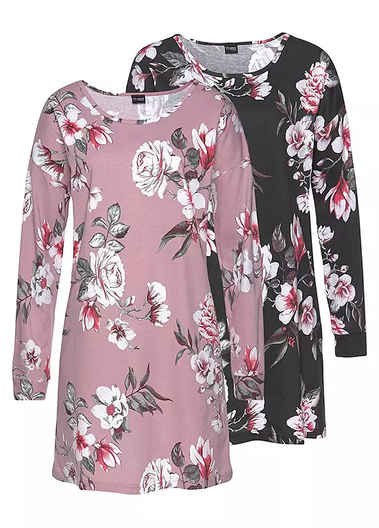 These fashionable nightgowns come in a practical double pack. They are cut short with long, overcut sleeves and a classic round neckline. Made from high-quality cotton in a floral print design.