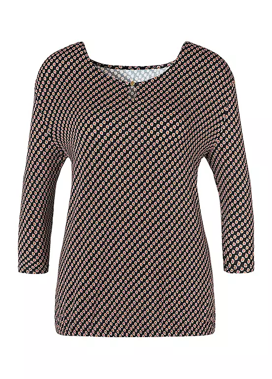 Beautiful all-over print design and a small cut-out detail at the bottom of the round neckline, including shiny buttons. The soft, stretch viscose quality is comfortable and ensures a beautiful, flowing look.