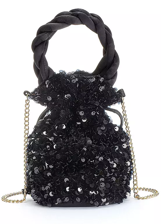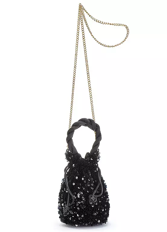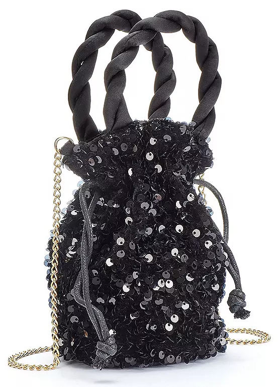 Sequinned bag with cored handles and chain straps. Perfect for those glam nights out on the town. Dimensions approx. 19H x 12W cm.