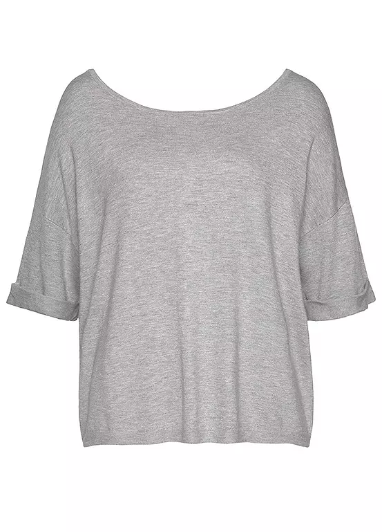 Trendy short-sleeved jumper featuring a back with button placket. Styled with dropped shoulders and a wide fit. Can be combined in many ways. Can be worn with the button placket at the back or front. Half-length sleeves with turn-ups. Made of soft fine knit quality with viscose.