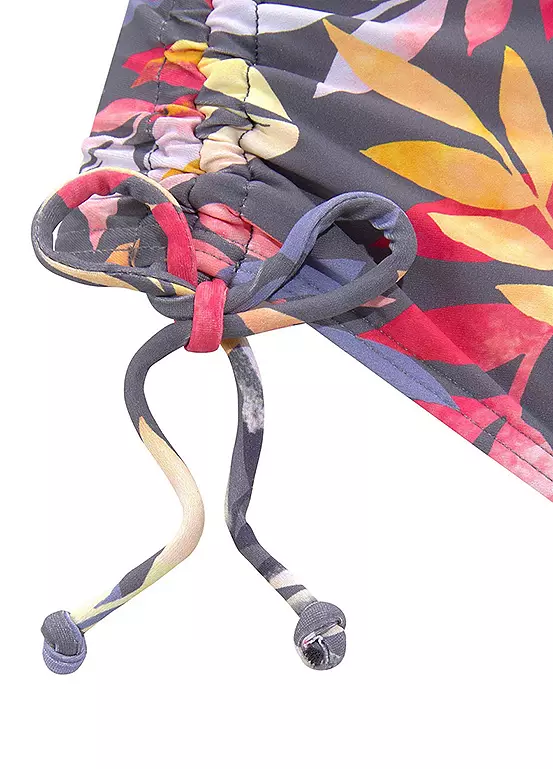 Bikini bottoms in a slightly higher cut that can be gathered at the side, while each pair is unique because the print is always slightly different. Mix and match to create your own beach look. Each piece is unique. Adjustable.