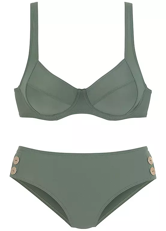 An underwired bikini with adjustable straps so it fits optimally and comfortably. The classic-style briefs in a high cut feature stylish button detail on the side and the quick-drying material ensures a comfortable fit. Underwired. In different trendy colours. High cut briefs.