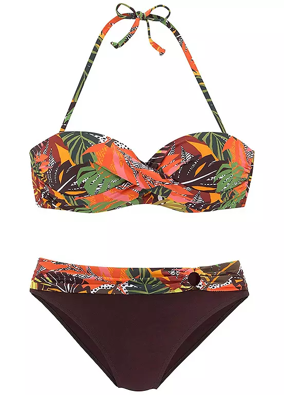 Underwired bandeau bikini by Vivance. Floral all-over print – each piece is unique. Top with padded cups and flexible inserts. Detachable halterneck to tie. Bikini bottoms with side ruffles. Soft microfiber quality. Floral all-over print. Padded cups with removable pads. Halter neck. Hand wash. Outer: 86% Polyamide, 14% Elastane Lining: 100% Polyamide Padding: 100% polyester.